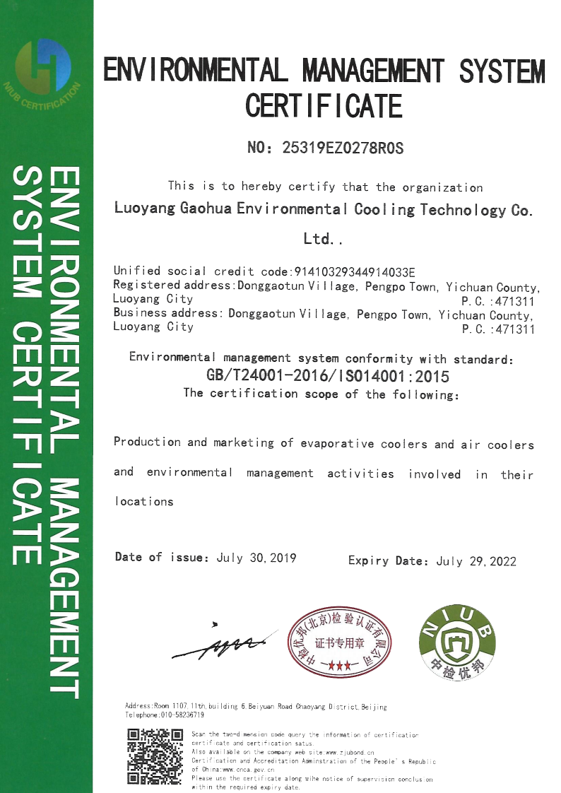 在洛陽(yáng)高華環(huán)保公司全體員工及合作伙伴的不懈努力下,經(jīng)過(guò)認(rèn)證公司專家的***、嚴(yán)格、細(xì)致的指導(dǎo)和審核,確認(rèn)洛陽(yáng)高華環(huán)保冷卻科技有限公司的蒸發(fā)式冷卻(凝)設(shè)備、空冷器的生產(chǎn)和銷售的質(zhì)量管理體系符合:GB/T19001-2016/ISO9001:2015 標(biāo)準(zhǔn)的要求,并于2019年7月30日,向洛陽(yáng)高華環(huán)保冷卻科技有限公司正式頒發(fā)了ISO9001質(zhì)量管理體系認(rèn)證證書。